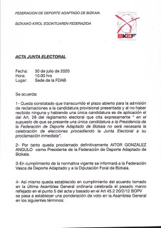 Se da por finalizado el proceso electoral 2020 a la Asamblea General y Presidencia de la Federación de Deporte adaptado con el nombramiento de D. AITOR GONZALEZ ANGULO  como Presidente