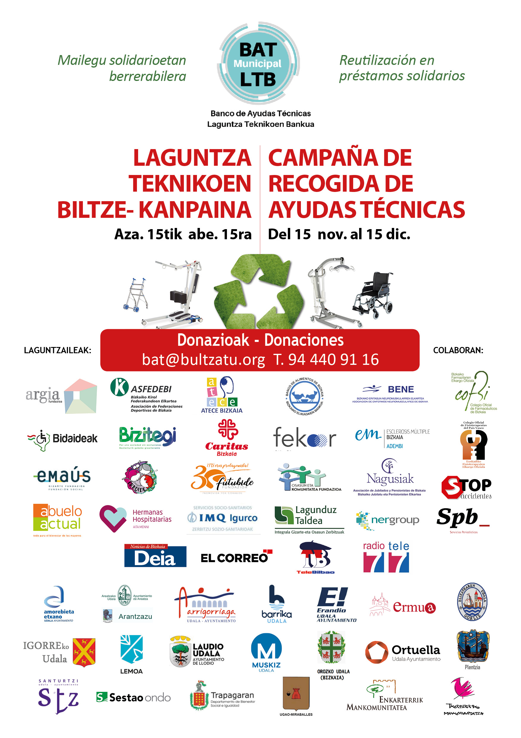 | Azaroaren 15etik abenduaren 15era laguntza teknikoak emateko kanpaina egingo da, eta gaur goizean aurkeztu da Bizkaia Aretoan. BAT Udal Laguntza Teknikoen Bankuak antolatu du kanpaina, beste 49 erakunderekin elkarlanean, elkarte, udal eta erakundeen artean. Kanpainaren helburua da egoera onean dauden laguntza-produktu erabiliak ahalik eta gehien biltzea. | Del 15 de noviembre al 15 de diciembre se celebra la campaña de donaciones de ayudas técnicas, que se ha presentado esta mañana en el Bizkaia Aretoa. Organizada por el Banco de Ayudas Técnicas, BAT Municipal, en colaboración con otras 49 entidades entre asociaciones, ayuntamientos y organizaciones, la campaña persigue el objetivo de recoger el máximo de productos de apoyo usados, que estén en buen estado. |