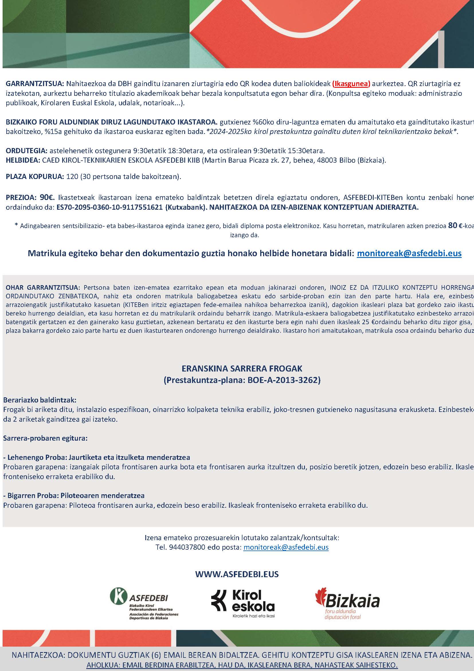 BIZKAIKO FORU ALDUNDIAK DIRUZ LAGUNDUTAKO IKASTAROA. gutxienez %60ko diru-laguntza ematen du amaitutako eta gainditutako ikasturte bakoitzeko, %15a gehituko da ikastaroa euskaraz egiten bada.*2024-2025ko kirol prestakuntza gainditu duten kirol teknikarientzako bekak*.