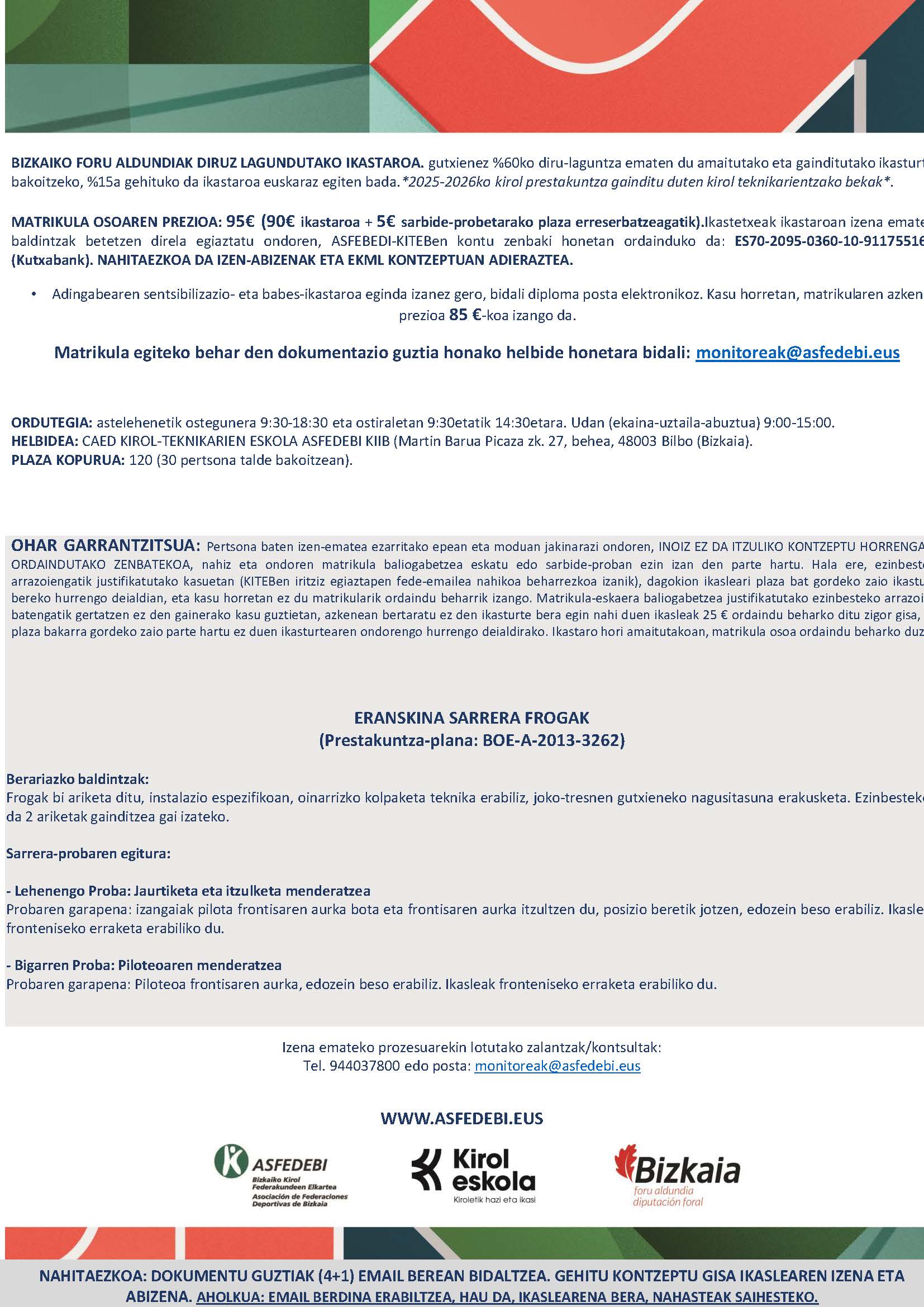 MATRIKULA OSOAREN PREZIOA: 95€ (90€ ikastaroa + 5€ sarbide-probetarako plaza erreserbatzeagatik). Zentroak ikastaroan izena emate baldintzak betetzen direla egiaztatu ondoren, ASFEBEDI-KITEBen kontu zenbaki honetan ordainduko da: ES70-2095-0360-10-911755162 (Kutxabank). NAHITAEZKOA DA IZEN-ABIZENAK ETA EKML KONTZEPTUAN ADIERAZTEA.