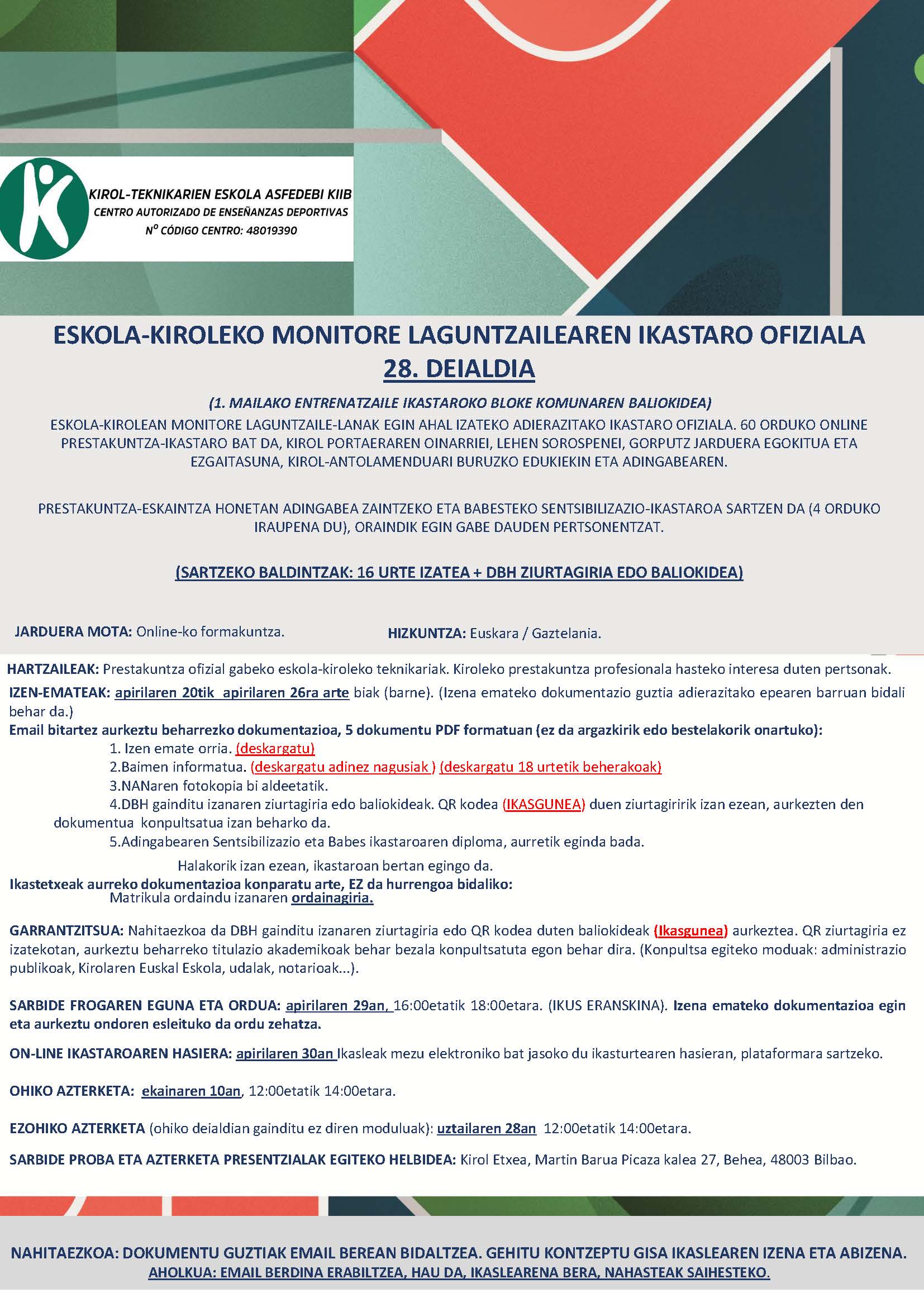 Eskola-kirolean monitore laguntzaile-lanak egin ahal izateko adierazitako ikastaro ofiziala.