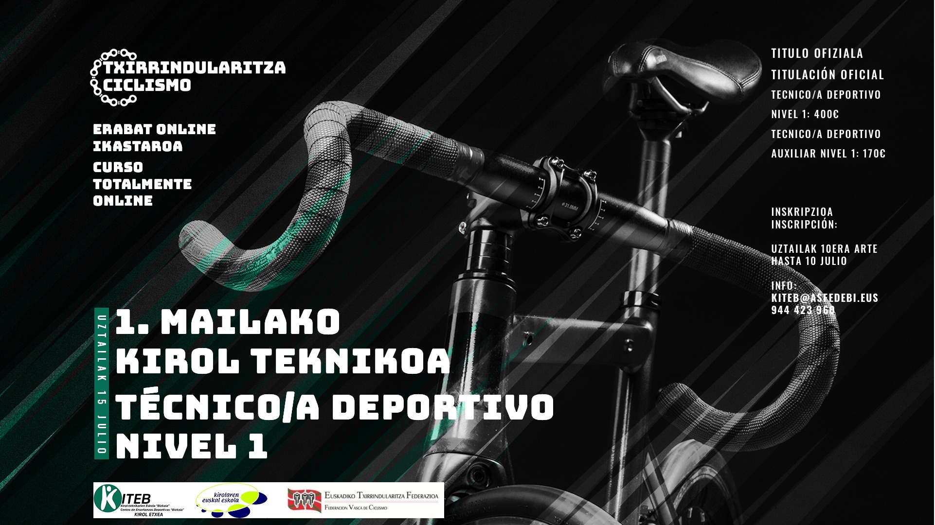 La Federación Vasca de Ciclismo junto con la Escuela Vasca de Deportes y el Centro de Estudios KITEB convocan el curso de TECNICO/A EN DEPORTIVO NIVEL 1 EN CICLISMO.