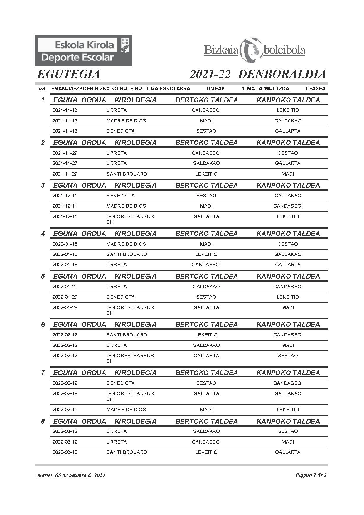 2021-22 denboraldiko boleiboleko Eskola kiroleko alebin mailako egutegia Calendario alevin de voleibol de deporte escolar de la temporada 2021-22