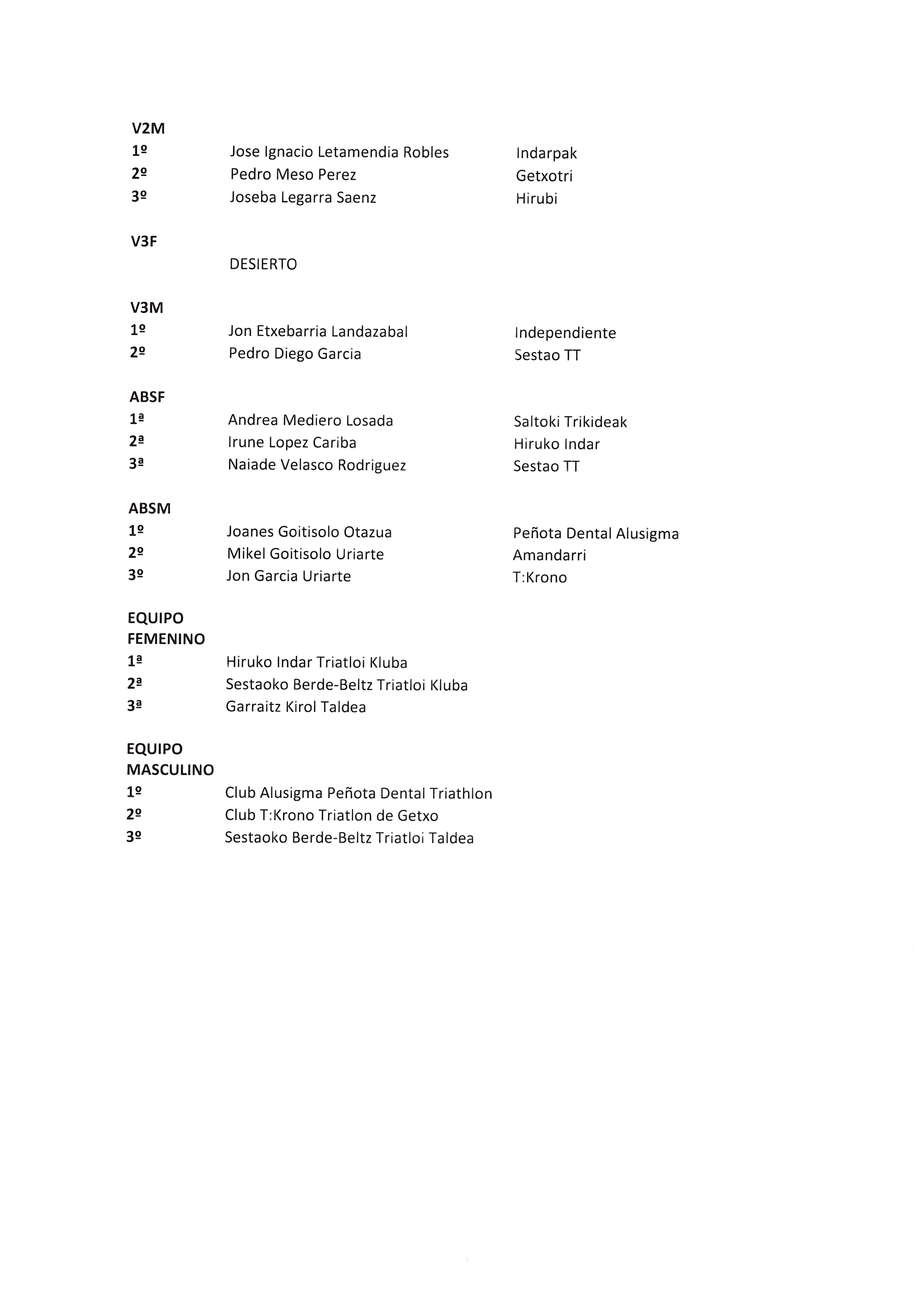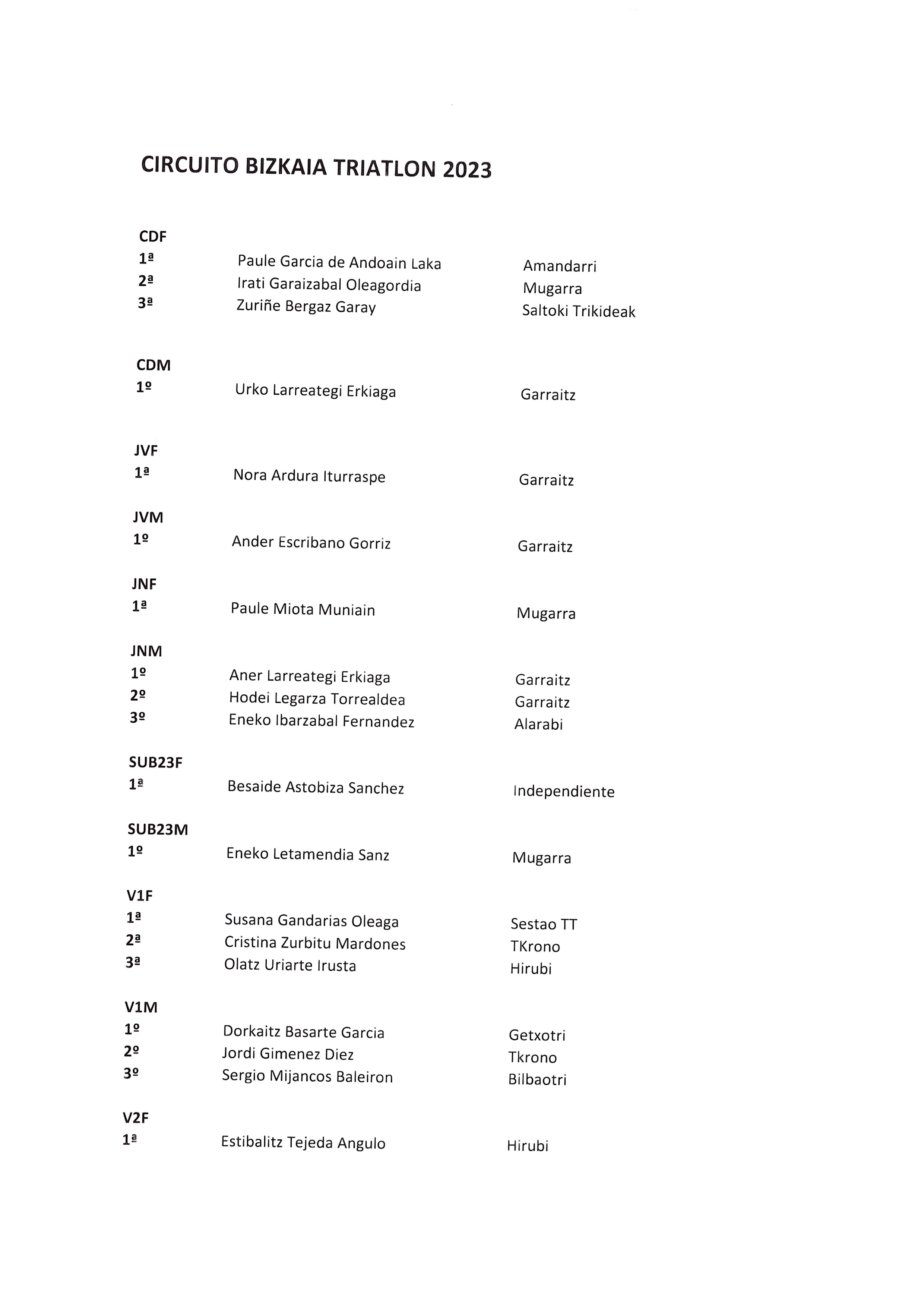 Estos son los resultados provisionales del CIRCUITO DE TRIATLÓN DE BIZKAIA 2023. Lamentablemente este año no habrá Circuito de duatlón porque solo se ha realizado una prueba en Bizkaia. Los resultados serán provisionales hasta el día 20 de Diciembre. Tenéis hasta ese día para enviarnos vuestras consultas o alegaciones. El día 21 de Diciembre se publicará la lista de ganadores definitiva, y ya no se admitirán reclamaciones. La entrega de premios tendrá lugar el día 28 de Diciembre, a la tarde, en el Frontón Bizkaia, pero os enviaremos todos los detalles una vez se hayan publicado los ganadores de forma definitiva. Queremos aprovechar para daros las gracias a todos los deportistas que participáis en las pruebas bizkaina y, por supuesto, a los organizadores de las mismas, ya que sin vosotros no sería posible este Circuito. ----------------------------------------------- Hauek dira behin behineko BIZKAIKO 2023ko TRIATLOI ZIRKUITUAREN emaitzak. Zoritxarrez, aurten ez da Duatloi Zirkuiturik izango Bizkaian proba bakarra egin delako. Emaitzak behin-behinekoak izango dira abenduaren 20ra arte. Egun horretara arte duzue zuen kontsultak edo alegazioak bidaltzeko. Abenduaren 21ean argitaratuko da behin betiko irabazleen zerrenda, eta gero ez da erreklamaziorik onartuko. Sari banaketa abenduaren 28an izango da, arratsaldean, Bizkaia Frontoian, baina irabazleak behin betiko argitaratu ondoren xehetasun guztiak bidaliko dizkizuegu. Eskerrak eman nahi dizkizuegu Bizkaiko probetan parte hartzen duzuen kirolari guztioi eta, jakina, proben antolatzaileei, zuek gabe ezinezkoa izango litzatekeelako zirkuitu hau.