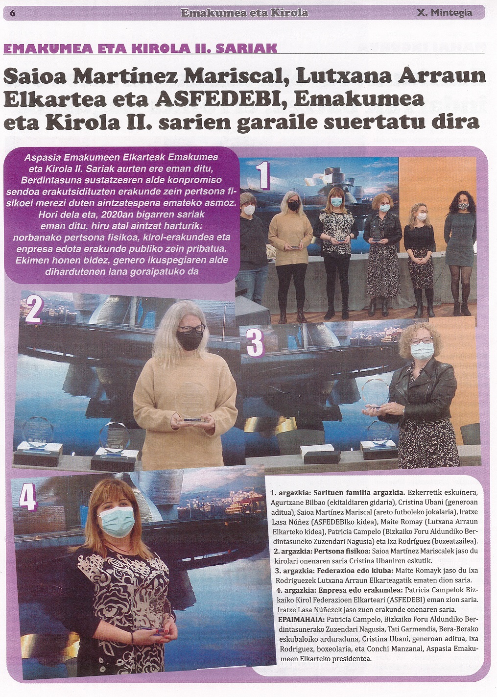 Abenduaren 23an Emakumeari eta Kirolari buruzko X. Mintegia egin zen, Aspasia Elkarteak antolatuta, eta ASFEDEBIk erakunde gisa jaso zuen saria, kirol-arloan emakumeen eta gizonen arteko berdintasuna sustatzeko konpromiso osoa erakusteagatik.