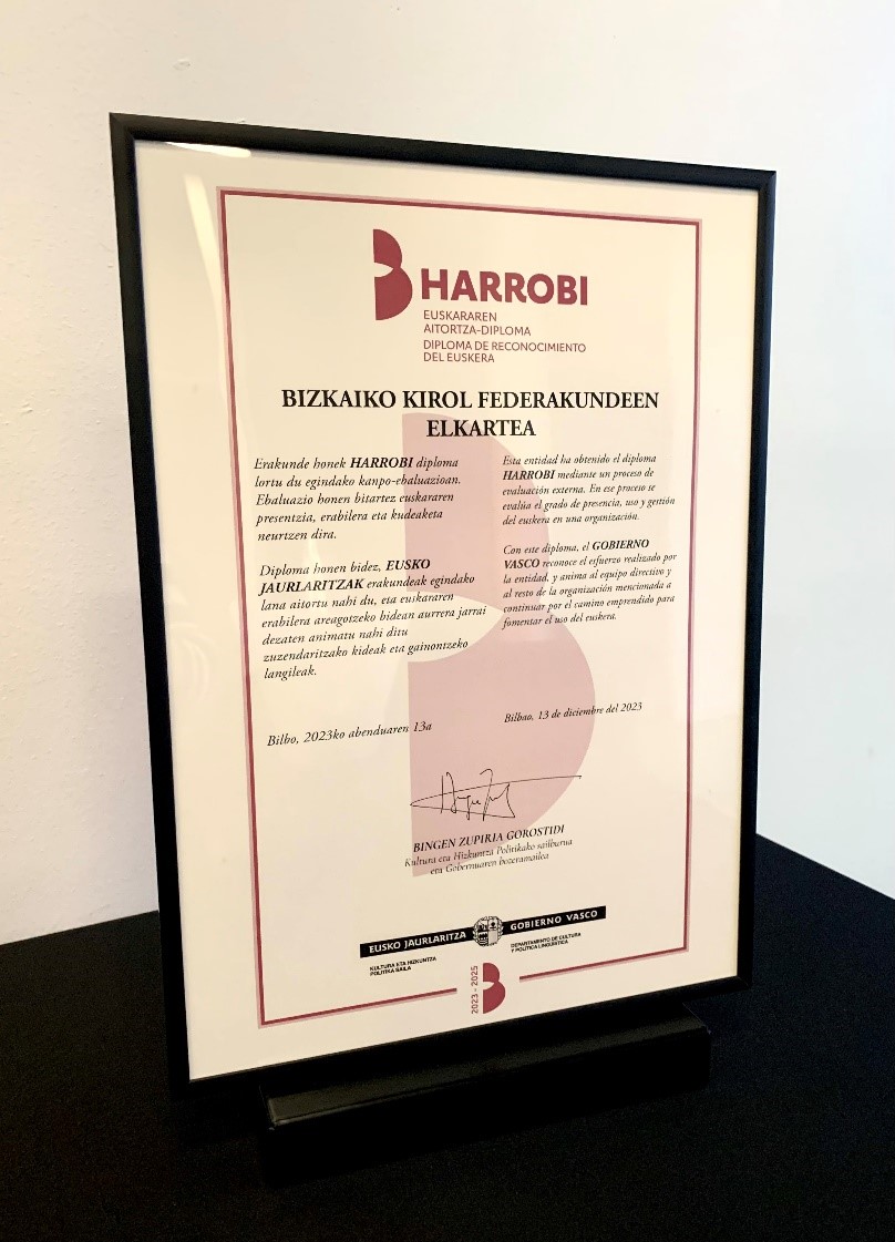 Atseginez jakinaratzen dizuegu, abenduaren 13an Eusko Jaurlaritzak euskararen erabilera aitortzeko ekitaldea egin zuela Bilboko Euskaldun Jauregian. Bertan, ASFEDEBIK Harrobi diploma jaso zuen, beste hainbat entitateekin batera.
