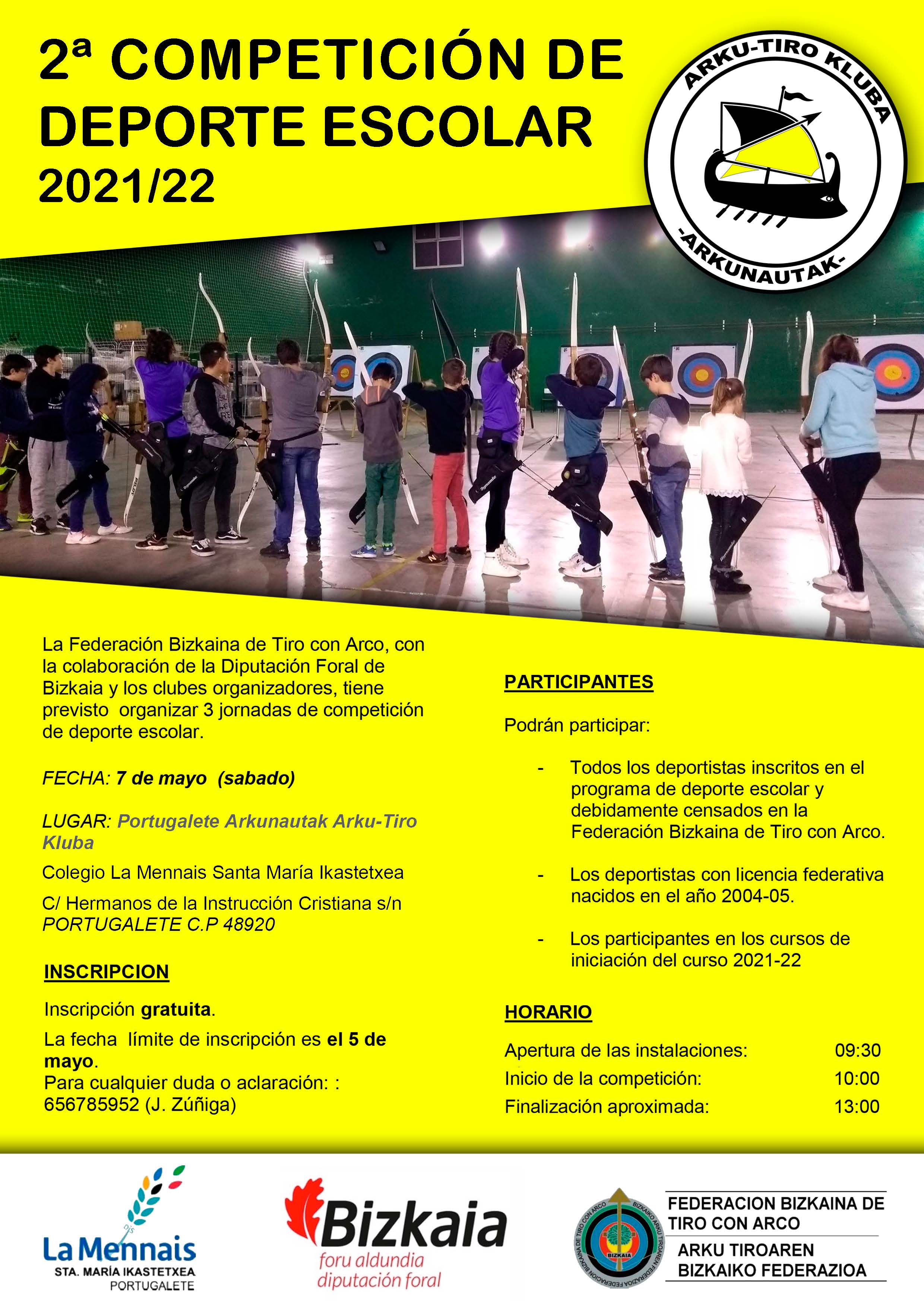 Denok dakizue zein indartsua den gure kluba arkulari gazteak prestatzearen alde; beraz, ilusio berezia egiten digu iragartzeak Bizkaiko eskola-kirolerako arku-tiroko lehiaketaren 2. jardunaldia antolatuko dugula.